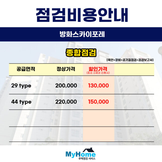 안녕하세요 마이홈주택점검서비스입니다 오늘은 많은 문의주시는 방화스카이포레 신축 아파트의 사전점검 업체 대행에 대해 말씀드리겠습니다 현재 입주 카페나 단체 대화방에 간단한 홍보 글 작성부터 같이 점검할 세대를 모집해 주신 입주민분께는 최대 비용 무료의 혜택으로 보답해 드리고 있으니 좋은 기회 되시길 바랍니다 입주 전 내 집 방문 행사를 앞두고 사전점검을 직접 하실지 아니면…