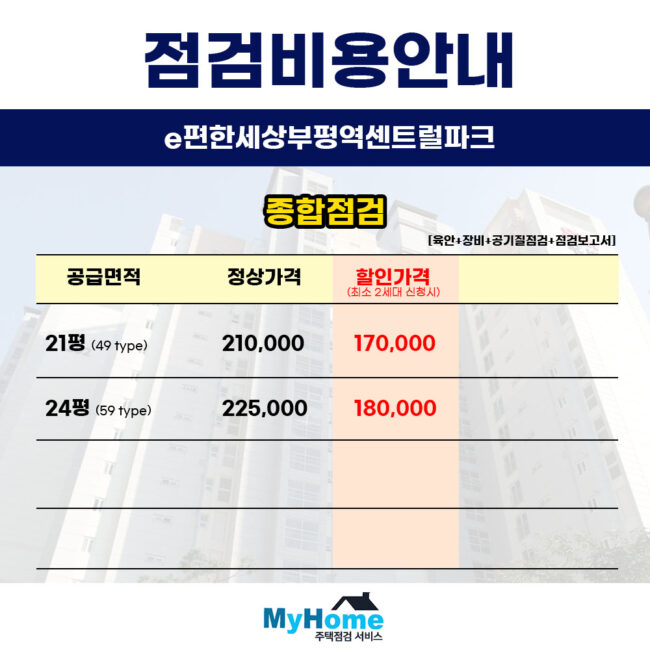 안녕하세요 마이홈주택점검서비스입니다 오늘은 많은 문의주시는 e편한세상부평역센트럴파크 사전점검 대행 업체와 비용에 대해 말씀드리겠습니다 현재 입주 카페나 단체 대화방에 간단한 홍보 글 작성부터 같이 점검할 세대를 모집해 주신 입주민분께는 최대 비용 무료의 혜택으로 보답해 드리고 있으니 좋은 기회 되시길 바랍니다 입주 전 내 집 방문 행사를 앞두고 사전점검을…