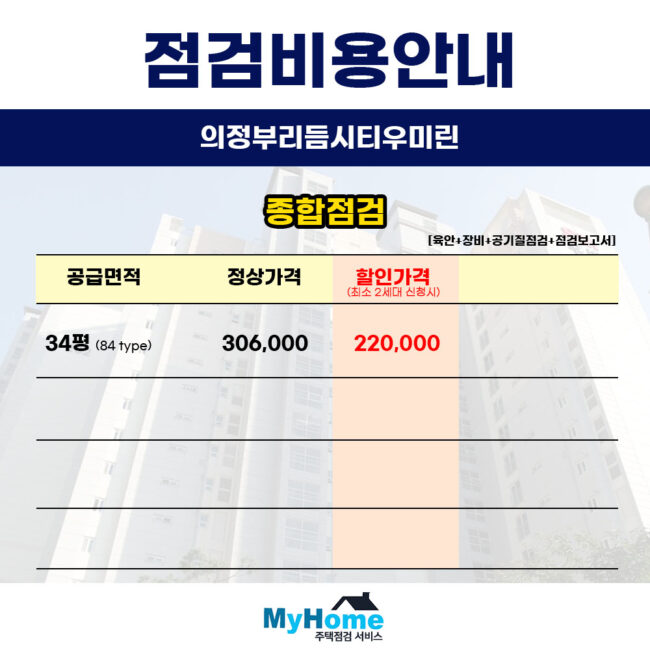 안녕하세요 마이홈주택점검서비스입니다 오늘은 많은 문의주시는 의정부리듬시티우미린 아파트 사전점검 대행 업체와 비용에 대해 말씀드리겠습니다 현재 입주 카페나 단체 대화방에 간단한 홍보 글 작성부터 같이 점검할 세대를 모집해 주신 입주민분께는 최대 비용 무료의 혜택으로 보답해 드리고 있으니 좋은 기회 되시길 바랍니다 입주 전 내 집 방문 행사를…
