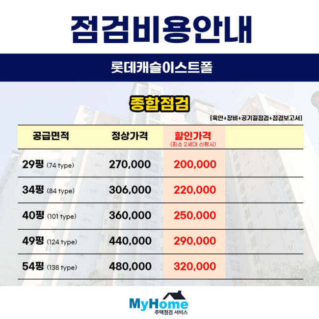 안녕하세요 마이홈주택점검서비스입니다 오늘은 많은 문의주시는 롯데캐슬이스트폴 아파트 사전점검 대행 업체와 비용에 대해 말씀드리겠습니다 현재 입주 카페나 단체 대화방에 간단한 홍보 글 작성부터 같이 점검할 세대를 모집해 주신 입주민분께는 최대 비용 무료의 혜택으로 보답해 드리고 있으니 좋은 기회 되시길 바랍니다 입주 전 내 집 방문 행사를…