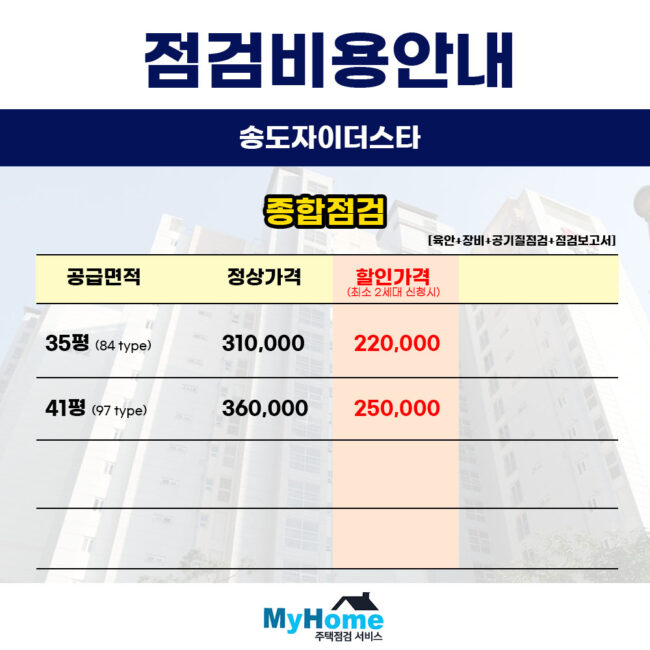 안녕하세요 마이홈주택점검서비스입니다 오늘은 많은 문의주시는 송도자이더스타 신축 아파트의 사전점검 대행 업체와 비용에 대해 말씀드리겠습니다 현재 입주 카페나 단체 대화방에 간단한 홍보 글 작성부터 같이 점검할 세대를 모집해 주신 입주민분께는 최대 비용 무료의 혜택으로 보답해 드리고 있으니 좋은 기회 되시길 바랍니다 입주 전 내 집 방문 행사를 앞두고…