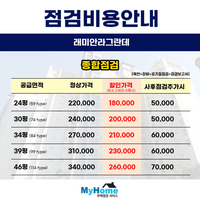 안녕하세요 마이홈주택점검서비스입니다 오늘은 많은 문의주시는 래미안라그란데 신축 아파트의 사전점검 대행 업체와 비용에 대해 말씀드리겠습니다 현재 입주 카페나 단체 대화방에 간단한 홍보 글 작성부터 같이 점검할 세대를 모집해 주신 입주민분께는 최대 비용 무료의 혜택으로 보답해 드리고 있으니 좋은 기회 되시길 바랍니다 입주 전 내 집 방문 행사를 앞두고 사전점검을…