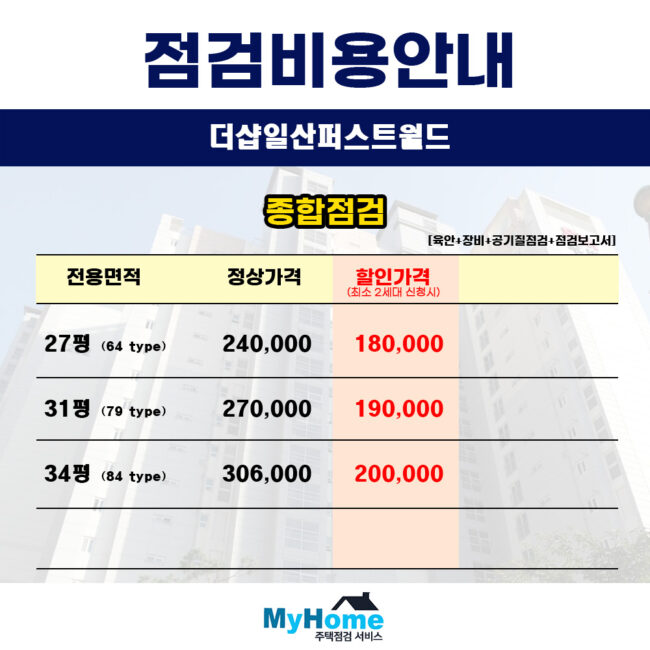 안녕하세요 마이홈주택점검서비스입니다 오늘은 많은 문의주시는 더샵일산퍼스트월드의 사전점검 대행 업체와 비용에 대해 말씀드리겠습니다 현재 입주 카페나 단체 대화방에 간단한 홍보 글 작성부터 같이 점검할 세대를 모집해 주신 입주민분께는 최대 비용 무료의 혜택으로 보답해 드리고 있으니 좋은 기회 되시길 바랍니다 입주 전 내 집 방문 행사를 앞두고 사전점검을 직접…