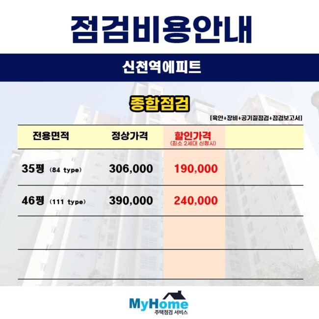안녕하세요 마이홈주택점검서비스입니다 오늘은 많은 문의주시는 신천역에피트 신축 아파트의 사전점검 대행 업체와 비용에 대해 말씀드리겠습니다 현재 입주 카페나 단체 대화방에 간단한 홍보 글 작성부터 같이 점검할 세대를 모집해 주신 입주민분께는 최대 비용 무료의 혜택으로 보답해 드리고 있으니 좋은 기회 되시길 바랍니다 입주 전 내 집 방문 행사를 앞두고 사전점검을…