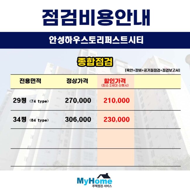 안녕하세요 마이홈주택점검서비스입니다 오늘은 많은 문의주시는 안성하우스토리퍼스트시티의 사전점검 대행 업체와 비용에 대해 말씀드리겠습니다 현재 입주 카페나 단체 대화방에 간단한 홍보 글 작성부터 같이 점검할 세대를 모집해 주신 입주민분께는 최대 비용 무료의 혜택으로 보답해 드리고 있으니 좋은 기회 되시길 바랍니다 입주 전 내 집 방문 행사를 앞두고 사전점검을 직접 하실지 아니면…