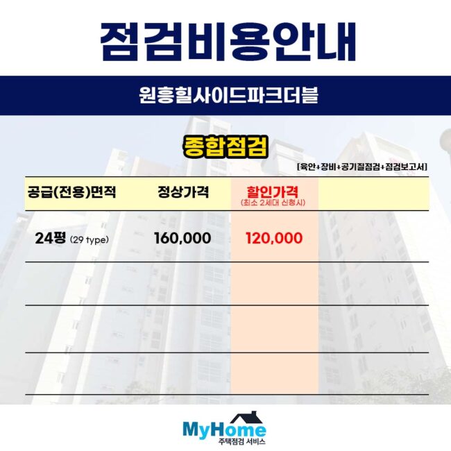 안녕하세요 마이홈주택점검서비스입니다 오늘은 많은 문의주시는 원흥힐사이드파크더블의 사전점검 대행 업체와 비용에 대해 말씀드리겠습니다 현재 입주 카페나 단체 대화방에 간단한 홍보 글 작성부터 같이 점검할 세대를 모집해 주신 입주민분께는 최대 비용 무료의 혜택으로 보답해 드리고 있으니 좋은 기회 되시길 바랍니다 입주 전 내 집 방문 행사를 앞두고 사전점검을…