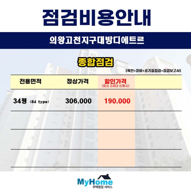 안녕하세요 마이홈주택점검서비스입니다 오늘은 많은 문의주시는 의왕고천지구 대방디에트르 신축 아파트의 사전점검 대행 업체와 비용에 대해 말씀드리겠습니다 현재 입주 카페나 단체 대화방에 간단한 홍보 글 작성부터 같이 점검할 세대를 모집해 주신 입주민분께는 최대 비용 무료의 혜택으로 보답해 드리고 있으니 좋은 기회 되시길 바랍니다 입주 전 내 집 방문 행사를…
