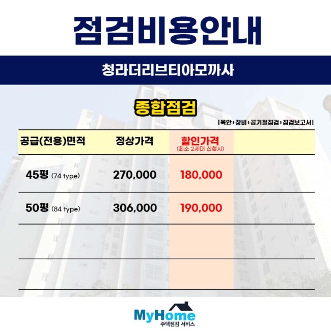 안녕하세요 마이홈주택점검서비스입니다 오늘은 많은 문의주시는 청라더리브티아모까사의 사전점검 대행 업체와 비용에 대해 말씀드리겠습니다 현재 입주 카페나 단체 대화방에 간단한 홍보 글 작성부터 같이 점검할 세대를 모집해 주신 입주민분께는 최대 비용 무료의 혜택으로 보답해 드리고 있으니 좋은 기회 되시길 바랍니다 입주 전 내 집 방문 행사를 앞두고 사전점검을…