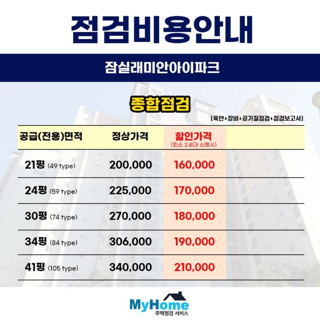 안녕하세요 마이홈주택점검서비스입니다 오늘은 많은 문의주시는 잠실래미안아이파크의 사전점검 대행 업체와 비용에 대해 말씀드리겠습니다 현재 입주 카페나 단체 대화방에 간단한 홍보 글 작성부터 같이 점검할 세대를 모집해 주신 입주민분께는 최대 비용 무료의 혜택으로 보답해 드리고 있으니 좋은 기회 되시길 바랍니다 입주 전 내 집 방문…