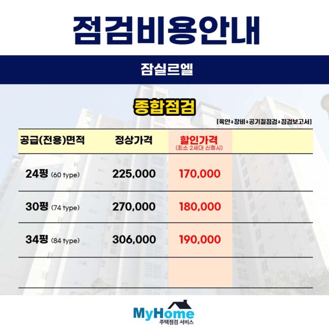 안녕하세요 마이홈주택점검서비스입니다 오늘은 많은 문의주시는 잠실르엘의 사전점검 대행 업체와 비용에 대해 말씀드리겠습니다 현재 입주 카페나 단체 대화방에 간단한 홍보 글 작성부터 같이 점검할 세대를 모집해 주신 입주민분께는 최대 비용 무료의 혜택으로 보답해 드리고 있으니 좋은 기회 되시길 바랍니다 입주 전 내 집 방문…