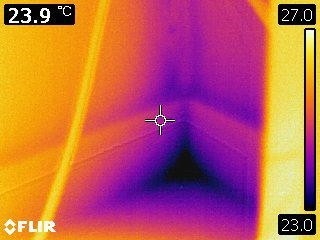 검게 나타나는 부분은 코너부의 단열부족으로 현재 온도차가 발생하고 있고, 동절기에는 결로와 곰팡이의 발생가능성이 높겠습니다