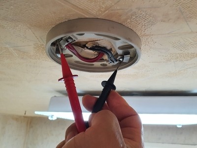 화재감지기가 정상작동되는지 테스터기를 통해 점검하고 있습니다