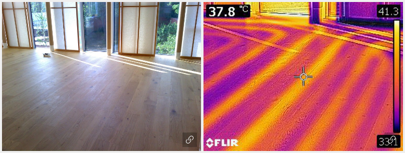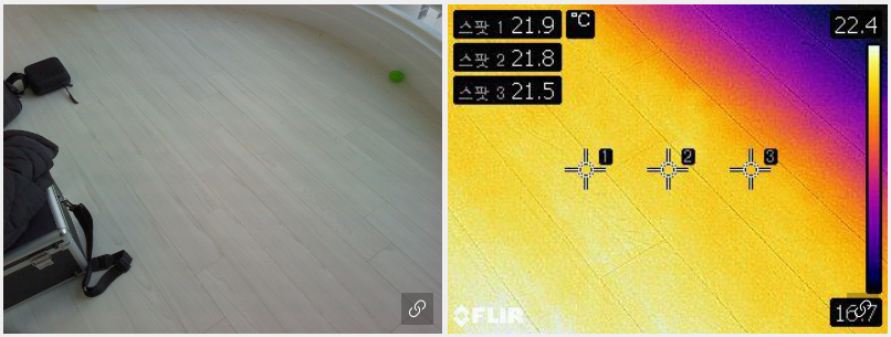 위의 사진에서 보시듯 정상적으로 확장된 바닥난방배관의 열화상 카메라 온도는 21도로 확인됩니다
