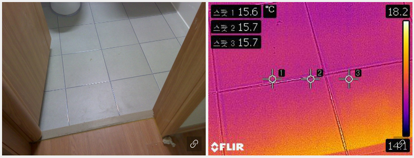 하지만 아래 욕실1의 열화상 카메라 사진에서는 바닥난방배관의 모습이 보이지않습니다