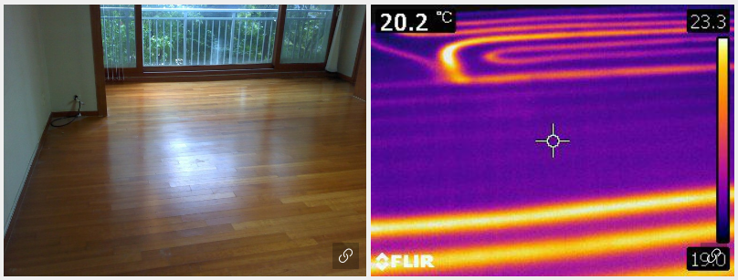 아래의 사진은 욕실1번앞 복도의 바닥난방배관 열화상 카메라 사진입니다