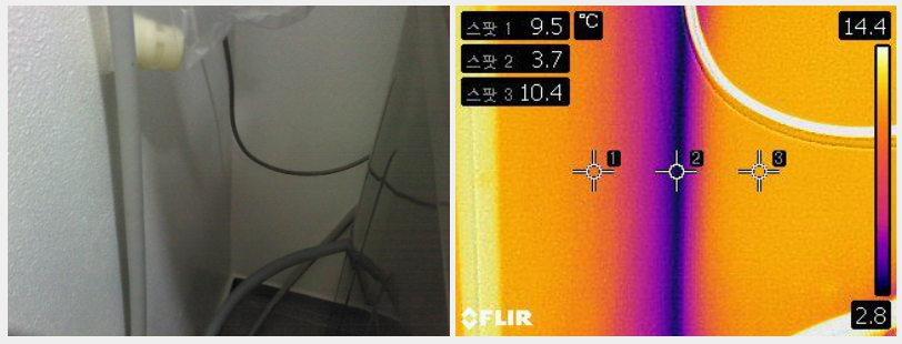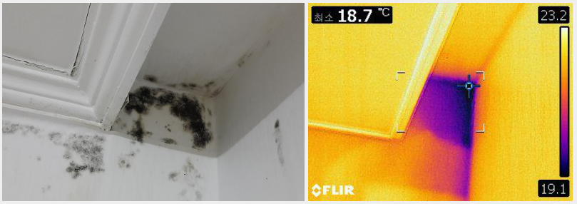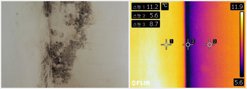 곰팡이가 생겨난 벽체의 내부온도는 단열불량으로 인해 온도가 주변보다 낮습니다