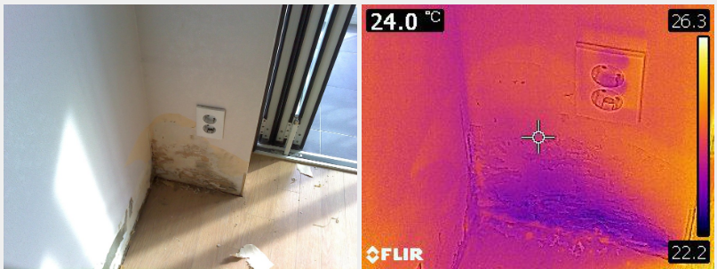 열화상 카메라를 통한 점검에서 내부의 수분이 감지되어 도배지를 뜯어보니 벽체가 약간 젖어있습니다