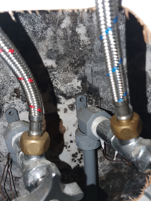 보통 발견되는 곳은 외벽과 밀착된 수납장 내부인데 한참을 찾다보니 수도관 근처에서 엄청난 곰팡이가 발견됩니다