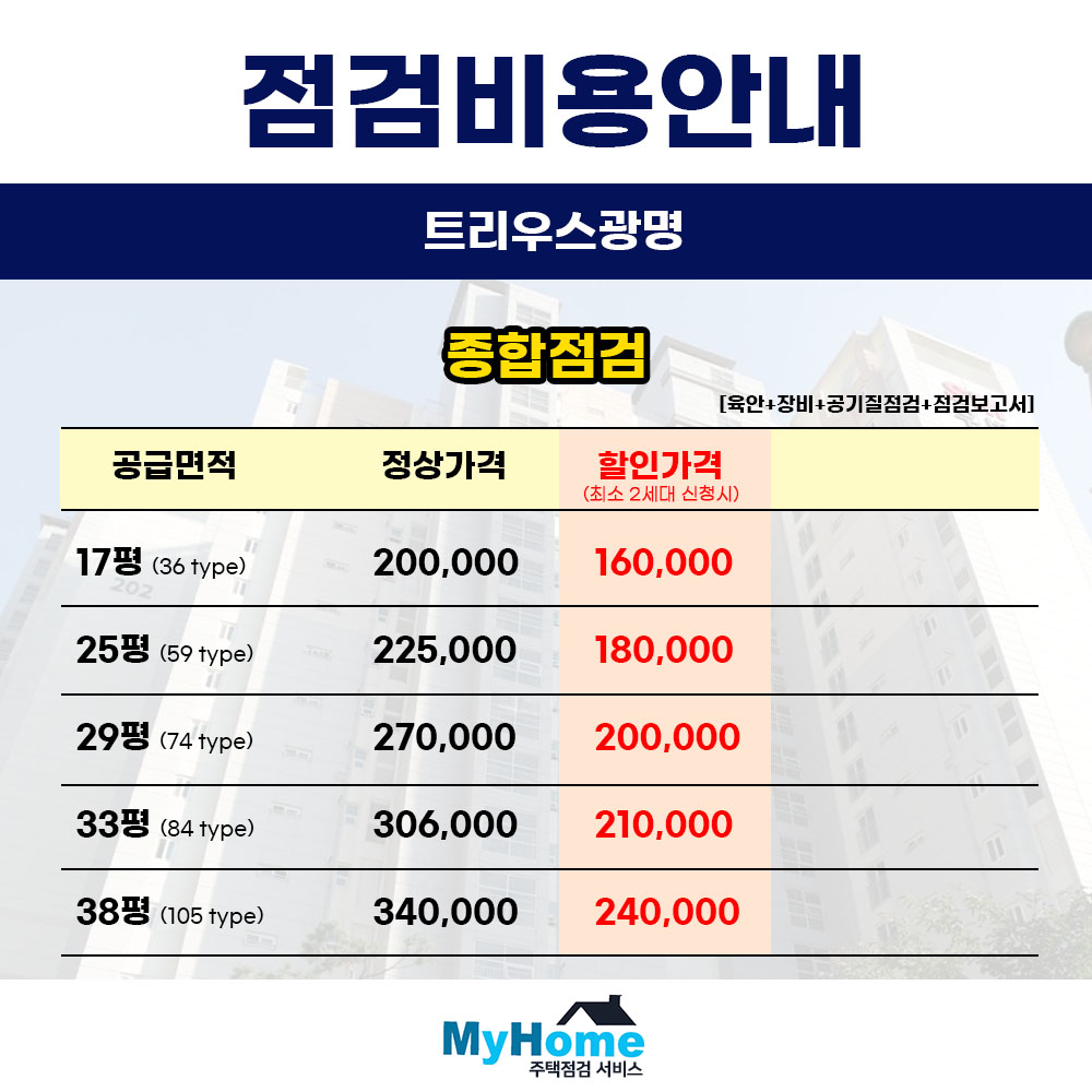 트리우스광명 신축 아파트의 사전점검 대행 비용은 입주 카페 내의 등록된 회사는 물론, 검색되는 어떤 곳들보다도 저렴하도록 가격을 책정하였습니다