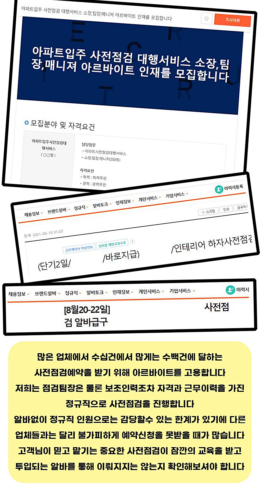 사실 소요된 입점비용과 이익까지 남기기 위해서는 최대한 많은 예약을 받아야 하고 세대수에 따라 검증되지 않은 알바 인원이라도 모집해야 하기 때문에 이로 인해 고객의 클레임은 발생될 수밖에 없습니다