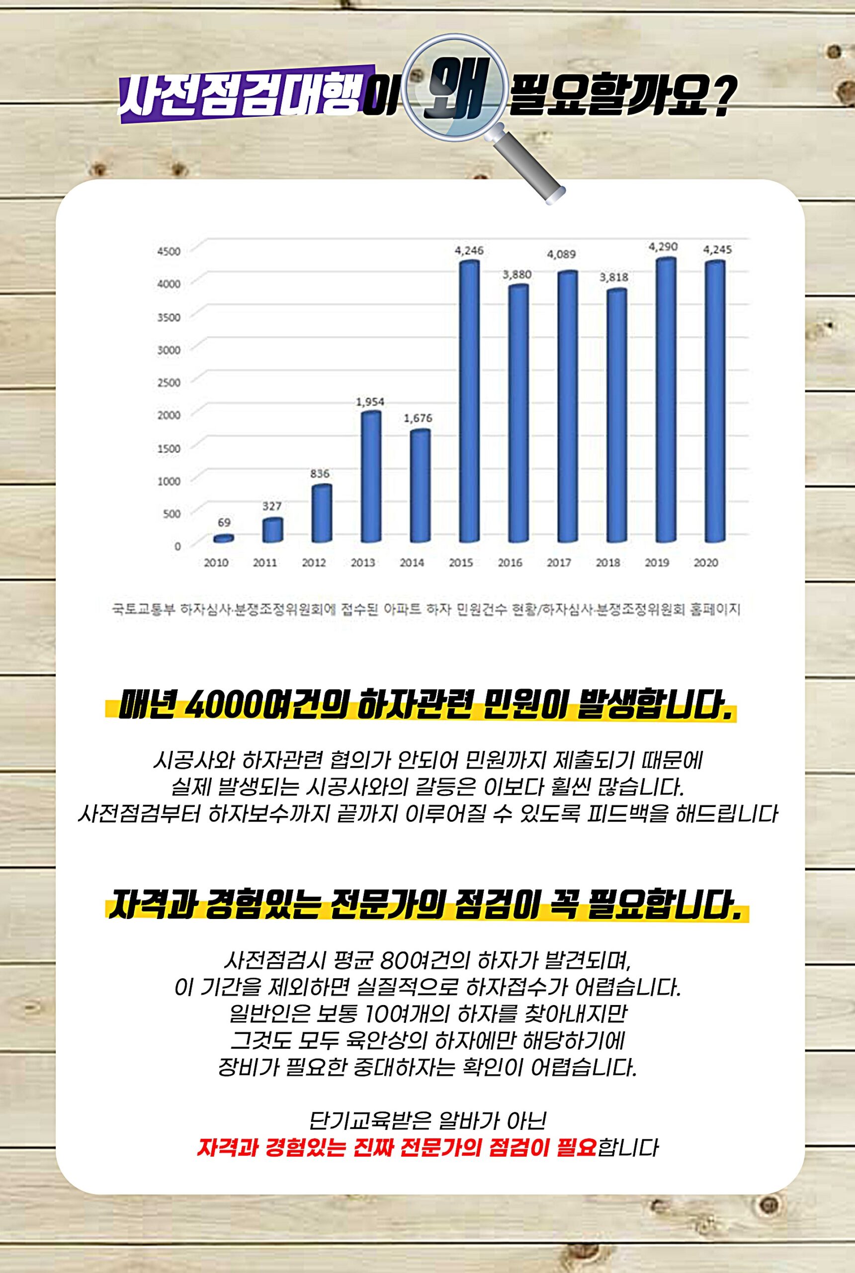 아무래도 직접 하자를 체크하시는 경우 건축에 대한 지식이 없으시기 때문에 눈에 보이는 하자가 없다고 우리 집은 이상 없다 생각하시거나 또는 단순한 부분에만 매몰되어서 정작 중요한 문제들은 놓치는 경우도 많습니다