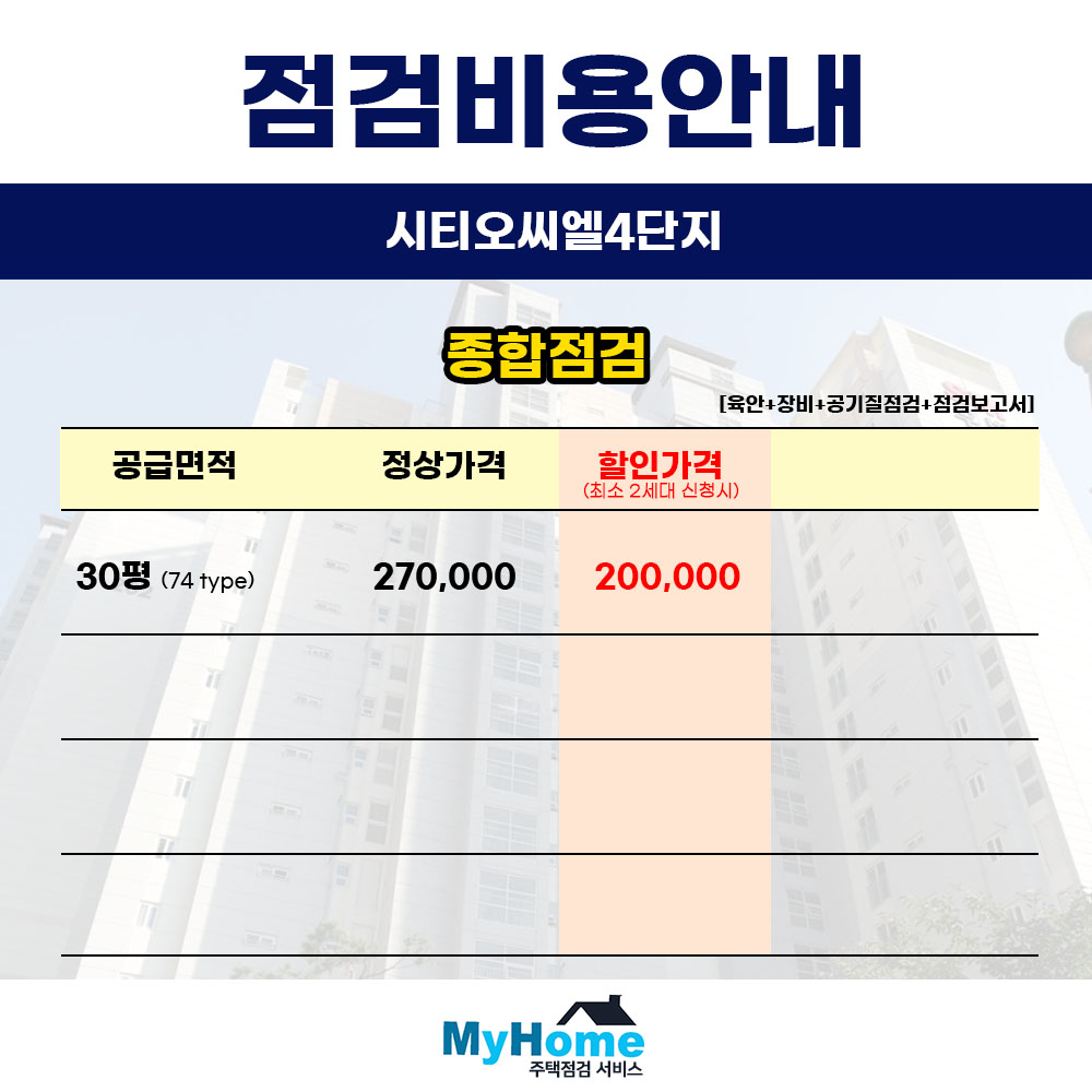시티오씨엘4단지 아파트 사전점검 대행 비용은 입주 카페 내의 등록된 회사는 물론, 검색되는 어떤 곳들보다도 저렴하도록 가격을 책정하였습니다