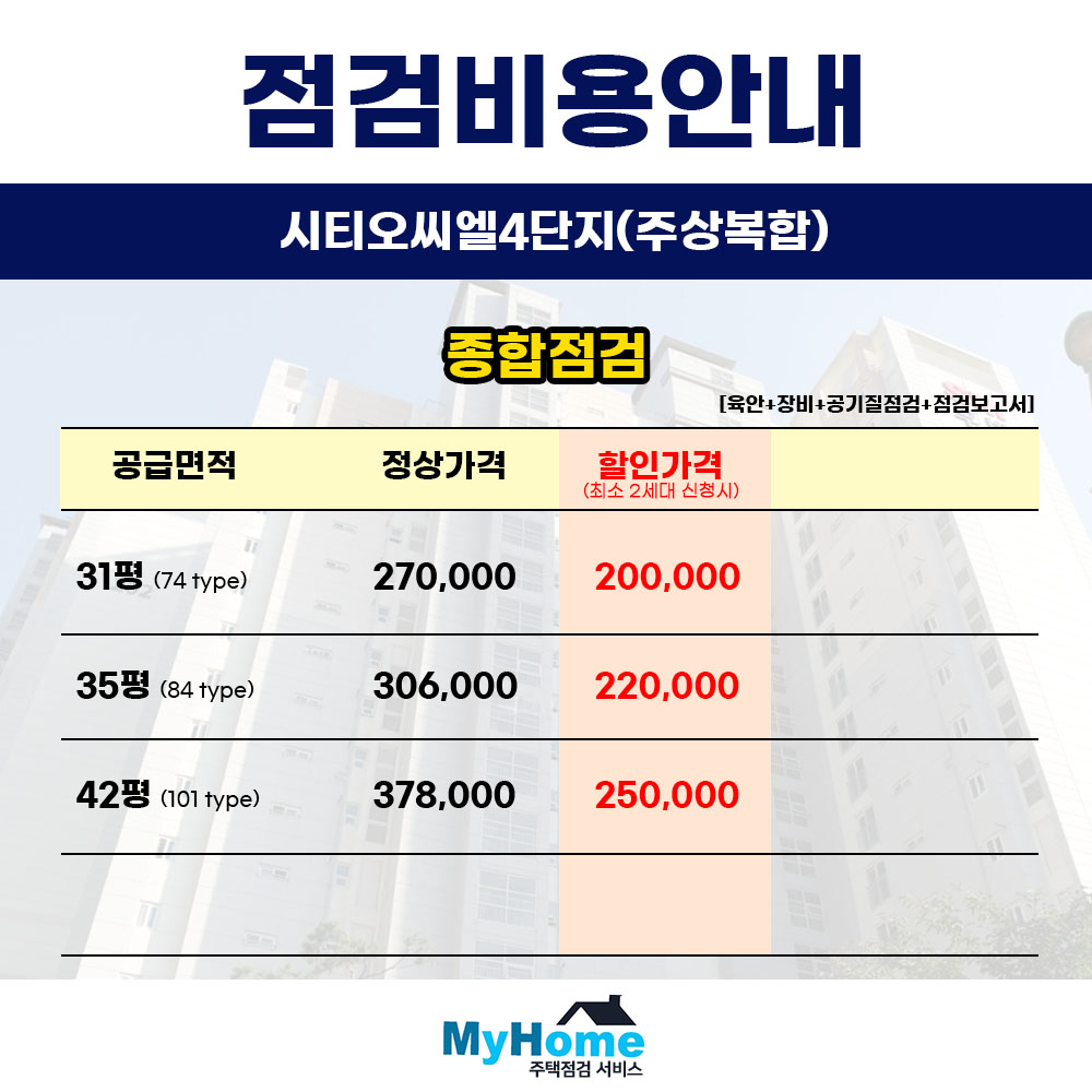 시티오씨엘4단지(주상복합) 사전점검 대행 비용은 입주 카페 내의 등록된 회사는 물론, 검색되는 어떤 곳들보다도 저렴하도록 가격을 책정하였습니다