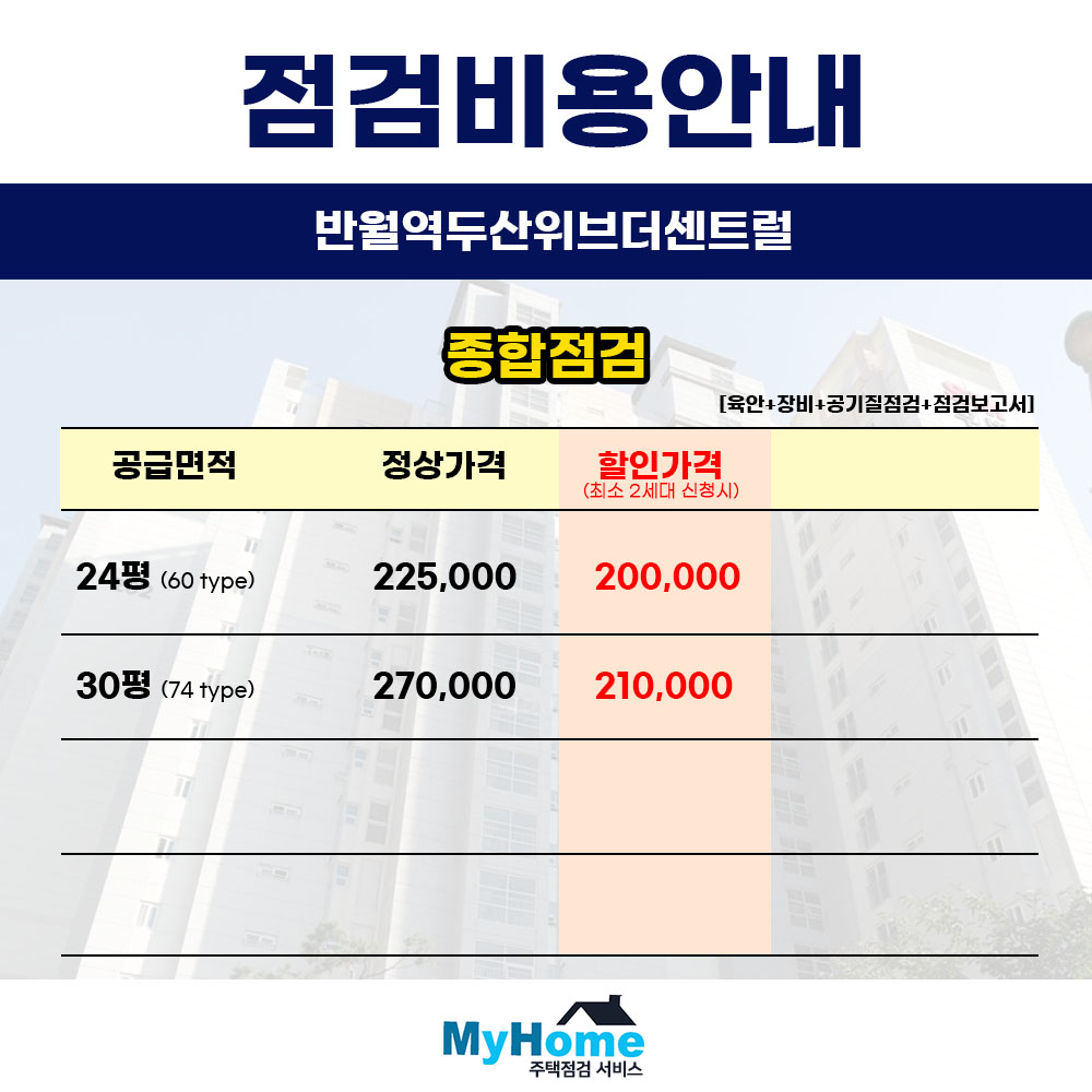 현재 입주 카페나 단체 대화방에 간단한 홍보 글 작성부터 같이 점검할 세대를 모집해 주신 입주민분께는 최대 비용 무료의 혜택으로 보답해 드리고 있으니 좋은 기회 되시길 바랍니다