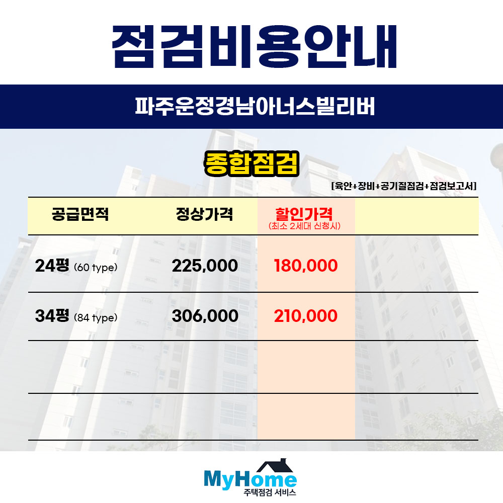 파주운정경남아너스빌리버 신축 아파트의 사전점검 대행 비용은 입주 카페 내의 등록된 회사는 물론, 검색되는 어떤 곳들보다도 저렴하도록 가격을 책정하였습니다