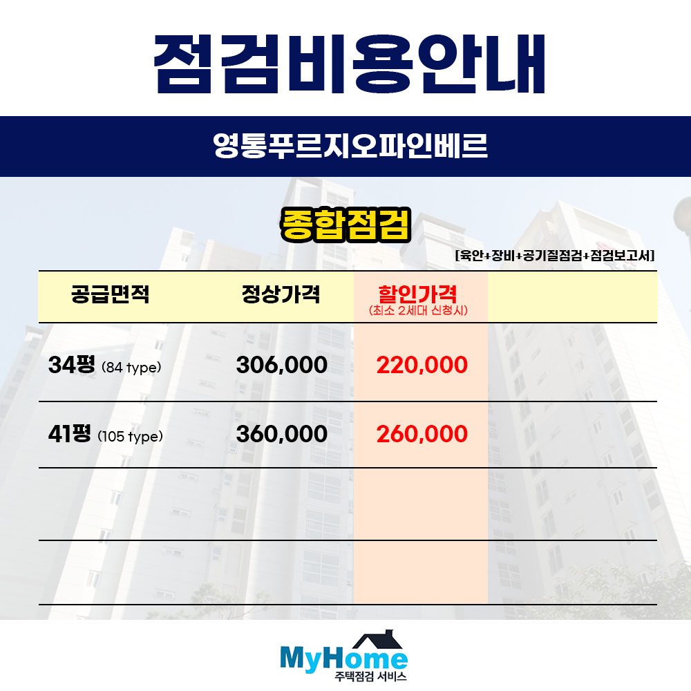 영통푸르지오파인베르 신축 아파트의 사전점검 대행 비용은 입주 카페 내의 등록된 회사는 물론, 검색되는 어떤 곳들보다도 저렴하도록 가격을 책정하였습니다