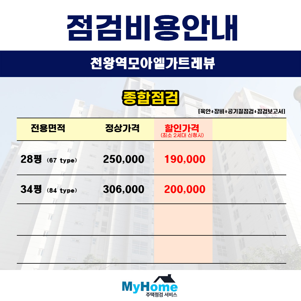 천왕 모아엘가 트레뷰의 사전점검 대행 비용은 입주 카페 내의 등록된 회사는 물론, 검색되는 어떤 곳들보다도 저렴하도록 가격을 책정하였습니다