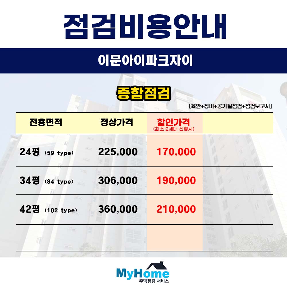 이문아이파크자이의 사전점검 대행 비용은 입주 카페 내의 등록된 회사는 물론, 검색되는 어떤 곳들보다도 저렴하도록 가격을 책정하였습니다