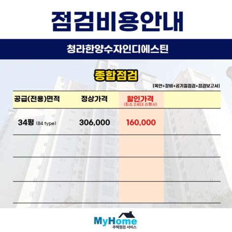 안녕하세요 마이홈주택점검서비스입니다 오늘은 많은 문의주시는 e편한세상시티청라의 사전점검 대행 업체와 비용에 대해 말씀드리겠습니다 현재 입주 카페나 단체…