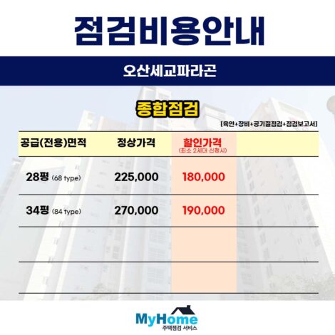 안녕하세요 마이홈주택점검서비스입니다 오늘은 많은 문의주시는 오산세교2지구모아미래도 신축 아파트의 사전점검 대행 업체와 비용에 대해 말씀드리겠습니다 현재 입주…
